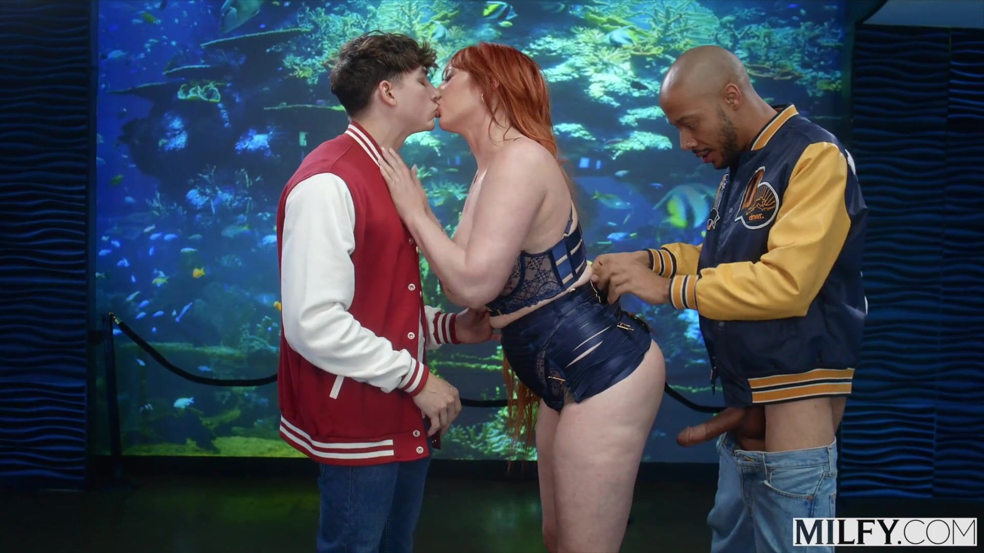 Sex ve trojce s prsatou milf Angel Wicky ve spodním červeném prádle
