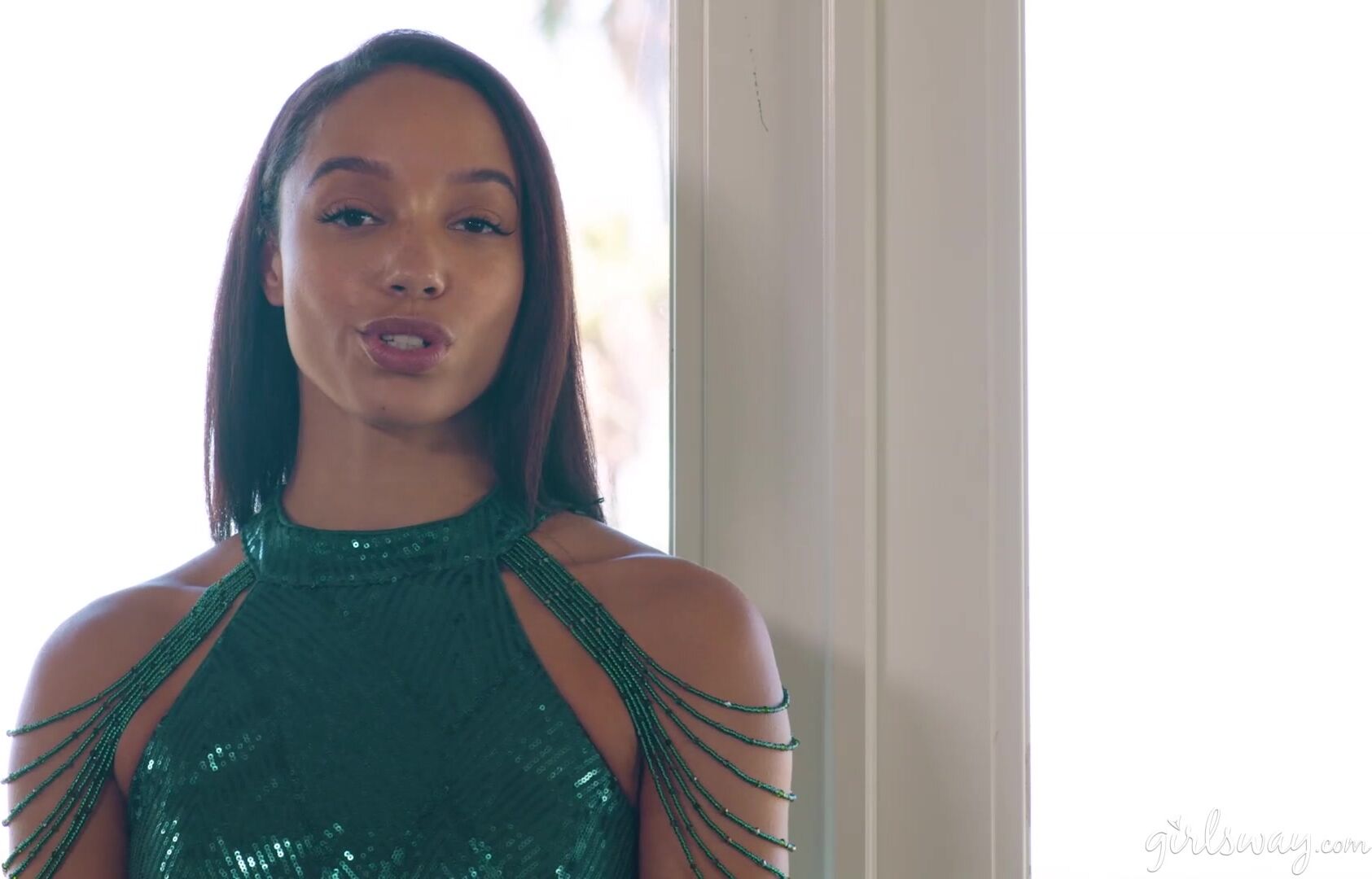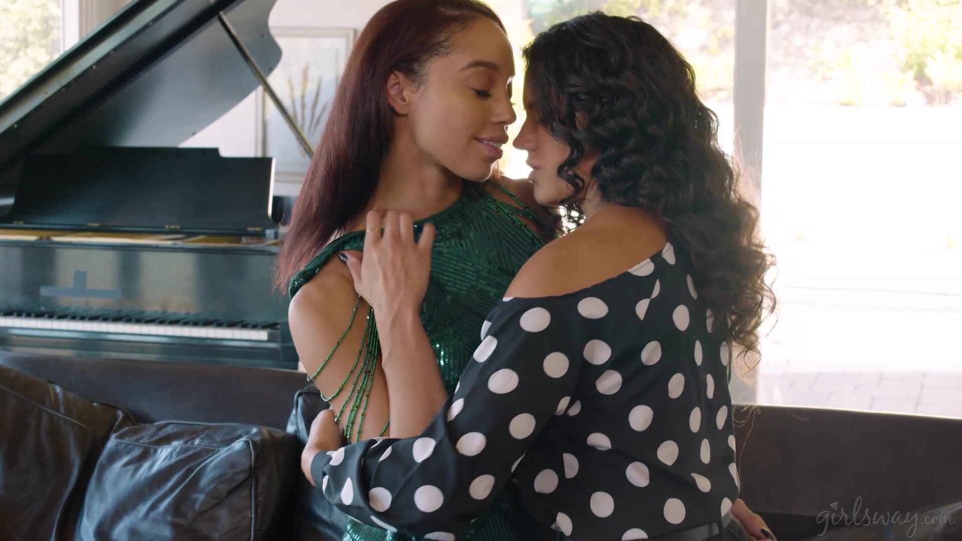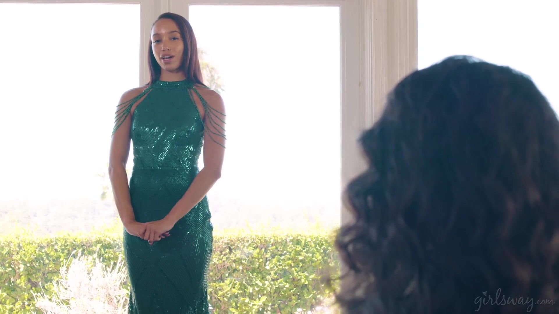 Penny Barber, a veteran pageant queen, has been coaching Alexis Tae for a pageant of her own over the last few weeks. The pageant is tomorrow, so they're doing a dress rehearsal today, with Alexis trying on a stunning green dress for the first time. Penny can hardly believe her eyes- Alexis looks riveting, and she just can't wait to see her prodigy grace the stage tomorrow in this splendid attire. They decide to run through some of the questions the judges will ask Alexis tomorrow. Alexis stands in the center of the living room, acting as if she is already on stage, with Penny sitting on the couch asking her a few sample questions from some index cards she has. Alexis answers beautifully but ends up practically moving Penny to tears when she describes how her main mission if she wins will be to advocate for LGBTQ+ rights. Alexis goes to comfort her, concerned for her mentor. Penny tells her not to worry- the speech was incredible and Penny is so proud of her. Penny only wishes that she could have had the same courage to answer like that when she was doing pageants all those years ago. Alexis, however, reminds Penny that the only reason she has the courage to do so now is because of Penny, and all the things she's taught her. And right now, she's willing to prove to Penny just how thankful she really is... with both her words... and her touch. | Penny Barber & Alexis Tae – You Leave Me Speechless.